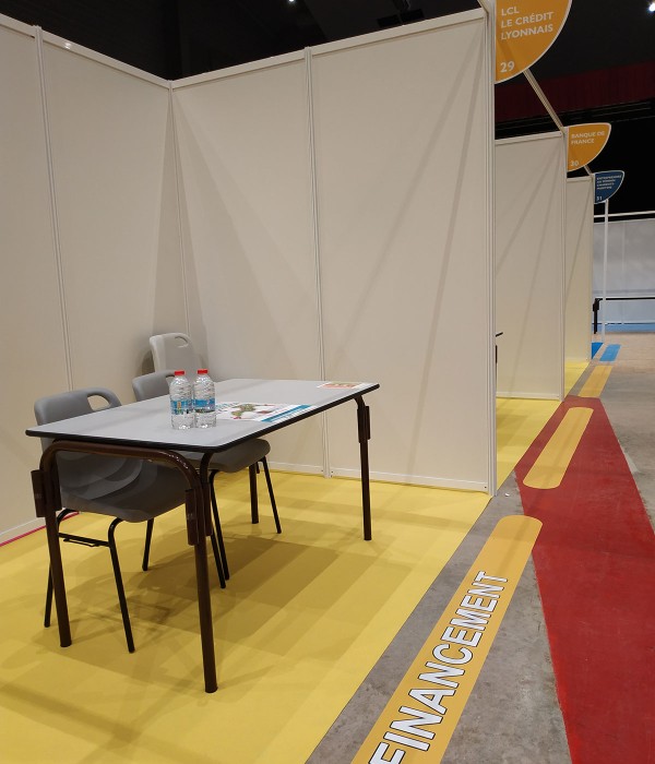 - Une fois sur site, tracer les halls en délimitant les emplacements des stands des exposants « nus » ou équipés, les espaces collectifs, les espaces VIP, point Presse, accueil, espaces conférences, commissariat général, point information, restaurant, zone d’animation, d’atelier, plateau de démonstration, plateau TV ..