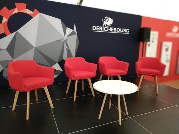 La Table basse "Nole" en blanc en diam.0.60 au centre de la scène à l'occasion de l'inauguration de la société DERICHEBOURG
