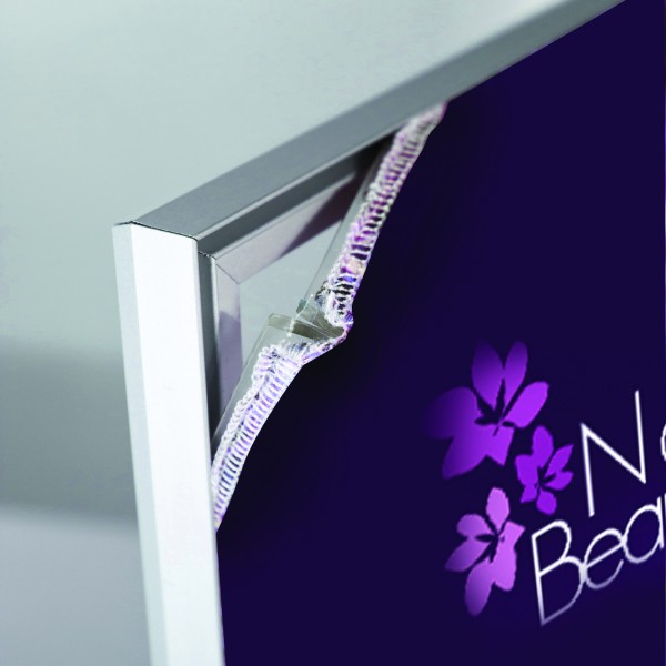dispose d'un profilé de 125 mm et d'un système d’éclairage tangentiel à LED plug and play prêt à l’emploi. Il offre une illumination puissante et parfaitement homogène. Particulièrement adaptée aux affichages de très grand format, cette solution assure une visibilité optimale, idéal pour attirer l’attention dans les environnements très fréquentés.