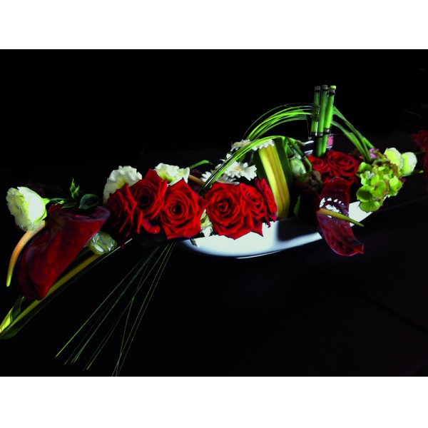 Cette décoration florale élégante associe harmonieusement des roses rouges éclatantes, des fleurs exotiques et des feuillages verts raffinés. Présentée dans un contenant moderne, elle apporte une touche de sophistication et de fraîcheur à tous vos événements ou intérieurs.