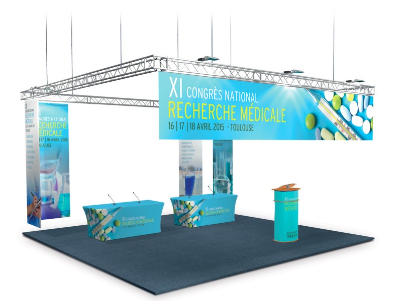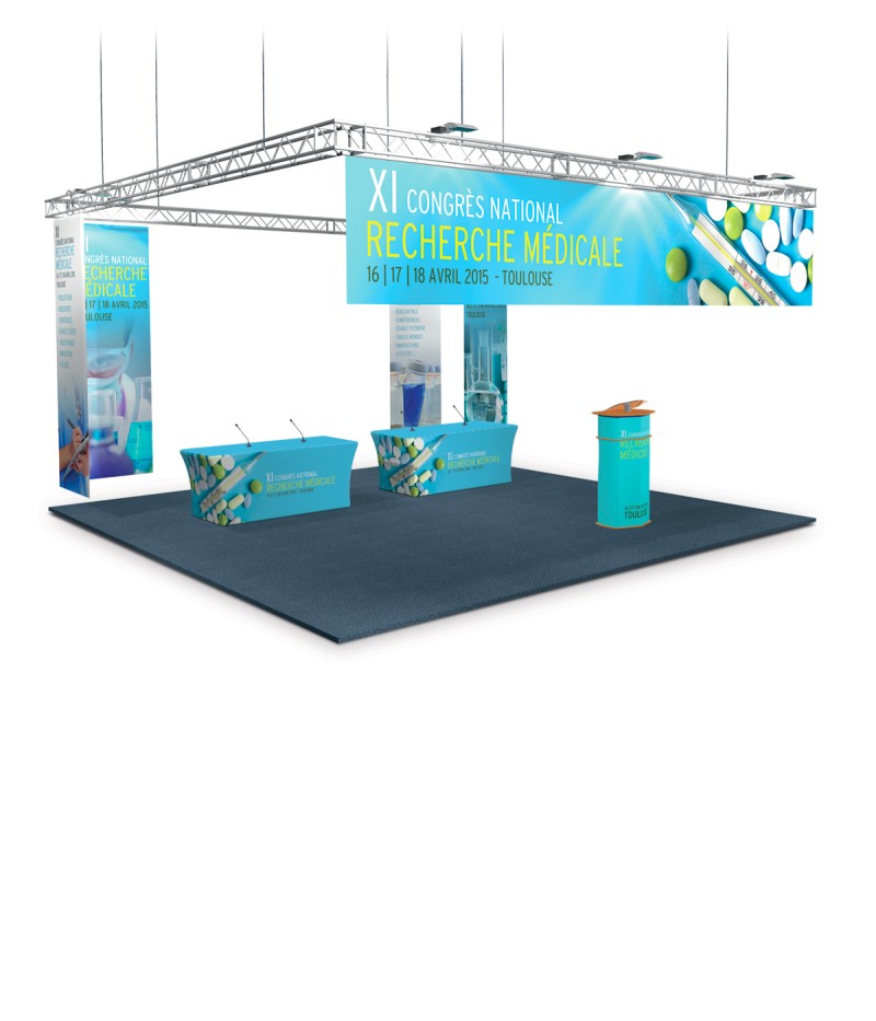 Infographie d'un aménagement d'accueil à l'occasion d'un congrès médical.