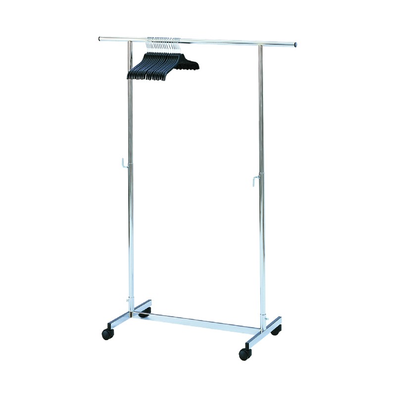 Vestiaire mobile en métal chromé, équipé de 20 cintres noirs robustes. Facile à déplacer grâce à ses roulettes, il est idéal pour organiser vos vêtements dans l'entrée, le bureau ou lors d'événements. Structure légère et pratique, garantissant un rangement optimal.